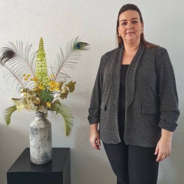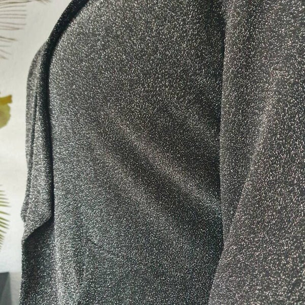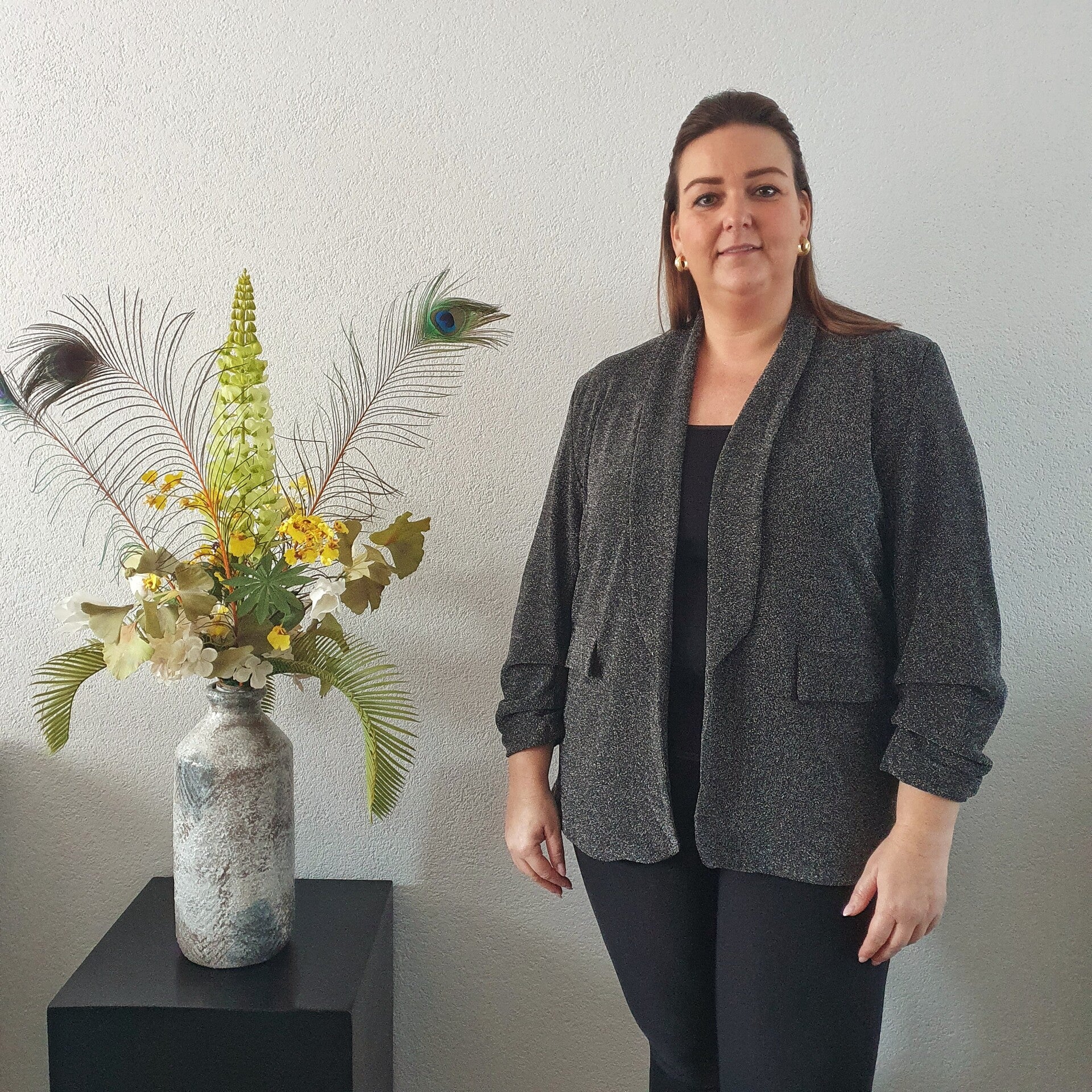 Leuke blazer met gedrapeerde mouwen in een zilvergrijze kleur met een glitter-effect. Dit is een wat ruimere blazer voor maat XL/XXL.